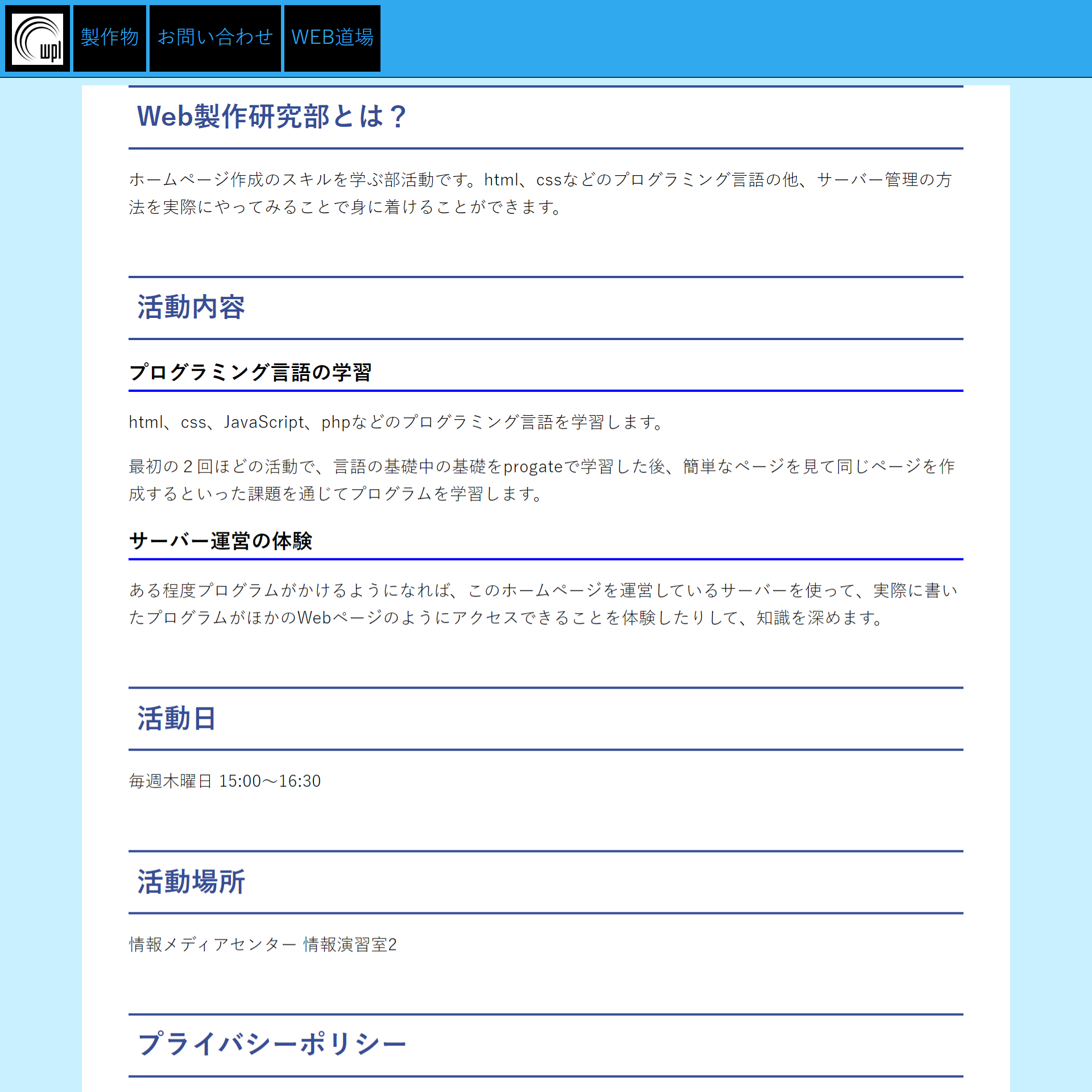 最初の2回ほどの活動でコードの書き方の基礎をprogateで学習した後、簡単な自己紹介ページを作成するといった課題を通じてプログラムを学習します。
